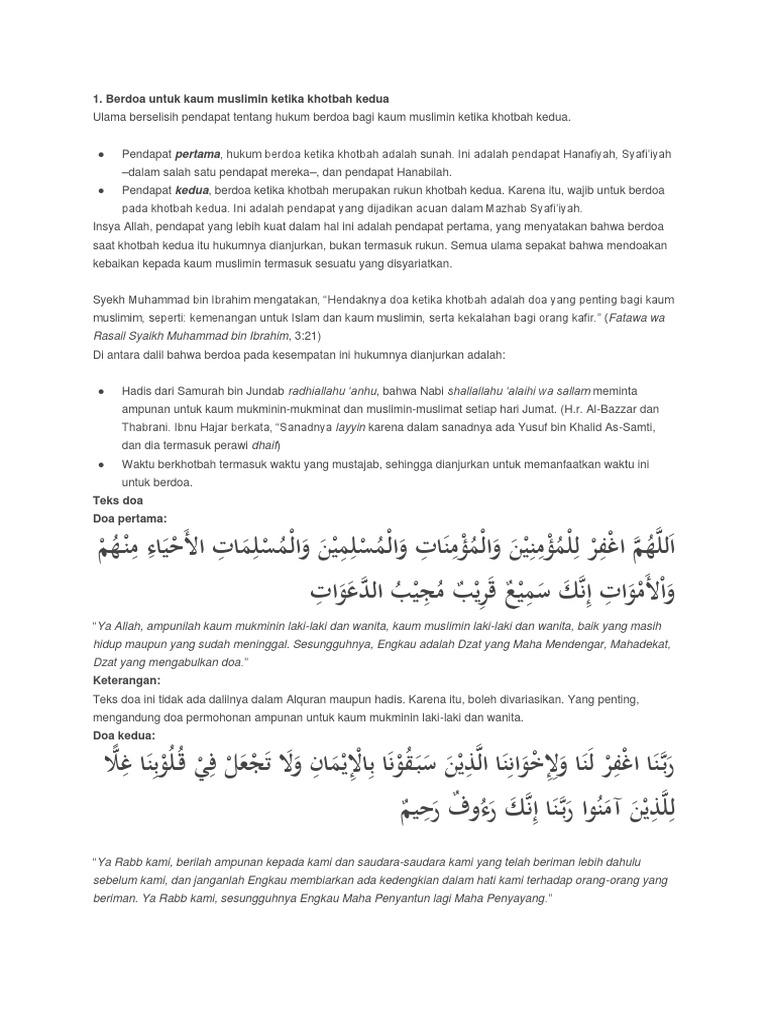 Bilal qusyairi suja' 3 years ago. Kita sudah mengetahui bahwa khutbah jum'at terdapat dua kali khutbah dan imam akan duduk di antara dua khutbah tersebut. Pada hari jumat, ada satu saat doa seorang muslim akan mustajab bila tepat dipanjatkan pada waktu yang dan pada kenyataannya, tidak ada doa khusus yang bisa dipanjatkan saat khatib duduk di antara dua khutbah sebagaimana yang telah dijelaskan. Khutbah dilaksanakan sesudah masuk waktu dhuhur. Download juga aplikasi lainnya dari doa hadist terpopuler apps gratis. 100%(1)100% encontró este documento útil (1 voto). Duduk di antara dua sujud. Intinya adalah doa mohon ampunan kepada allah di antara dua sujud dengan mengikuti nabi muhammad saw. Afwan ustadz, apakah ada doa/dzikir yang shahih yang diucapkan ketika khatib duduk di antara dua khutbah? Khutbah diucapkan dengan suara yang keras dan jelas. Di antara dalil bahwa berdoa pada kesempatan ini hukumnya dianjurkan adalah: Doa antara 2 khutbah jumaat. Doa antara 2 khutbah jumaat.