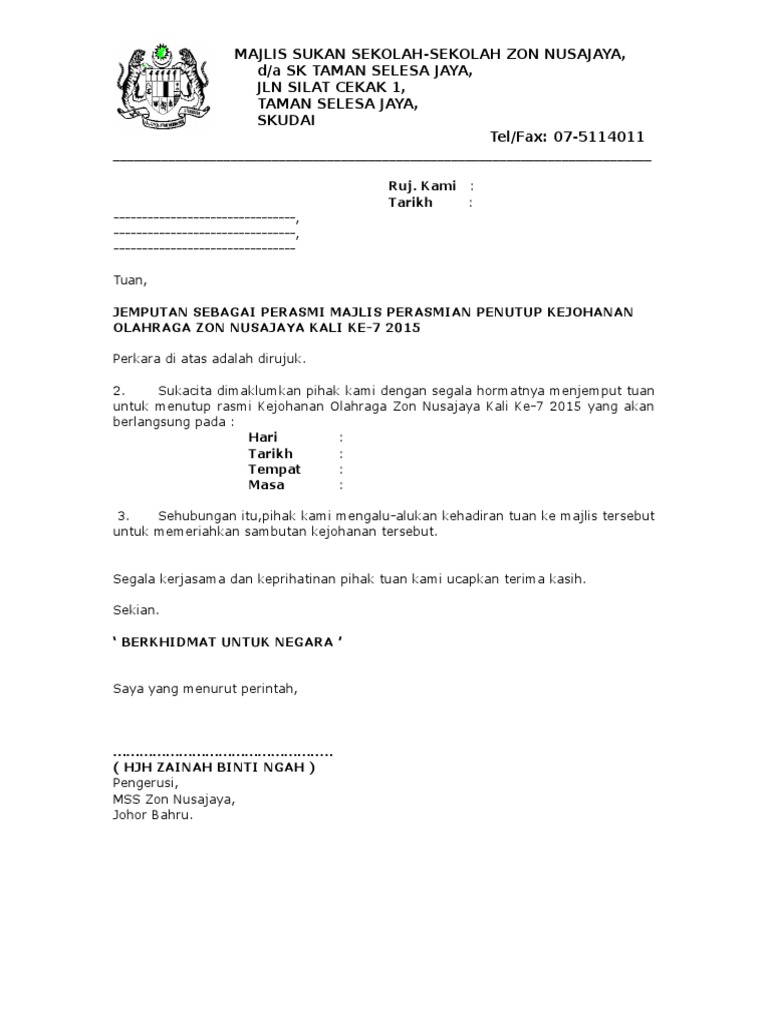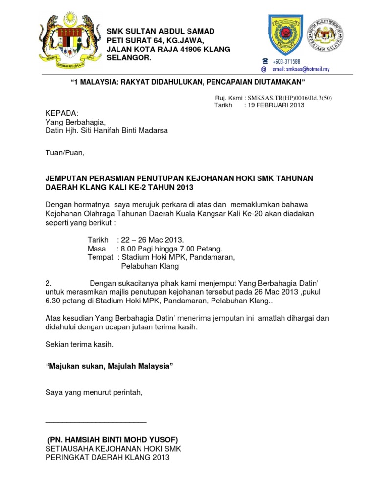 Pihak sekolah juga boleh memanggil tokoh korporat untuk merasmikan majlis yang diadakan dan memohon sumbangan ikhlas daripada mereka untuk menjayakan program kecemerlangan sekolah. Majlis seterusnya menjemput dan mempersilakan yang berbahagia, dr. Ghazali din, penasihat kelab penulisan kreatif dan deskriptif untuk menyampaikan ucapan dan sekaligus, merasmikan program bicara buku kita pada hari ini. Hassan abadin 0148635465 urawasan90@yahoo.com sity najwa mohd abd latif 0145180246 happywawa69@yahoo.com 5. Maklumat selanjutnya adalah seperti butiran berikut By kamarudin jaafar 13465 views. Surat jemputan ibu bapa mesyuarat p. Pengarah program majlis makan beradat wisma pegawai kadet palapes upsi pasukan latihan pegawai simpanan universiti pendidikan sultan idris 35900 tanjong malim perak darul ridzuan. Lihat surat panggilan/jemputan di bawah. 25 februari 2011 masa : Jemputan merasmikan dan menyampaikan hadiah hari anugerah cemerlang smk… 2006. Bagaimana untuk menulis surat jemputan penceramah secara rasmi? Untuk pertanyaan lanjut berhubung program, sila hubungi: